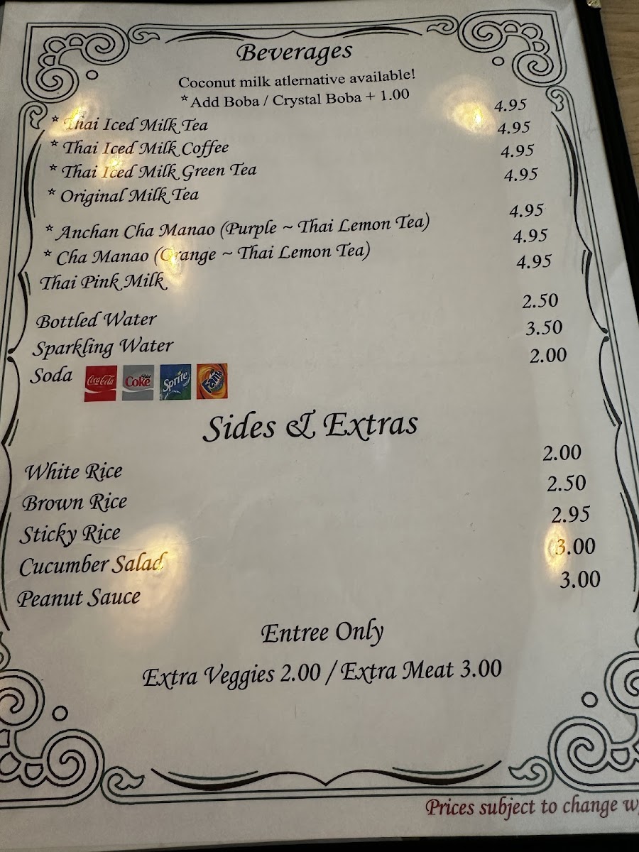 Side dishes such as White Rice, Brown Rice, Sticky Rice, Cucumber Salad, and Peanut Sauce provide the perfect complements to your meal, enhancing the flavors and textures of the main dishes. Additionally, the restaurant offers a variety of refreshing beverages like Singha, Sapporo, Asahi, Tiger, and San Miguel beers, allowing you to enjoy the perfect drink alongside your meal.